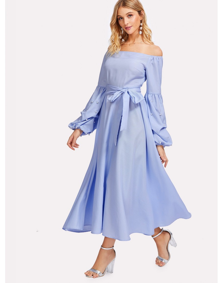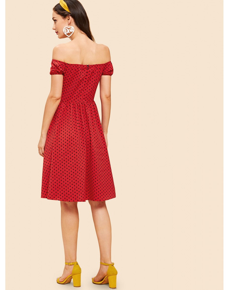 Polka Dot Bardot Neckline Tie Waist Dress
