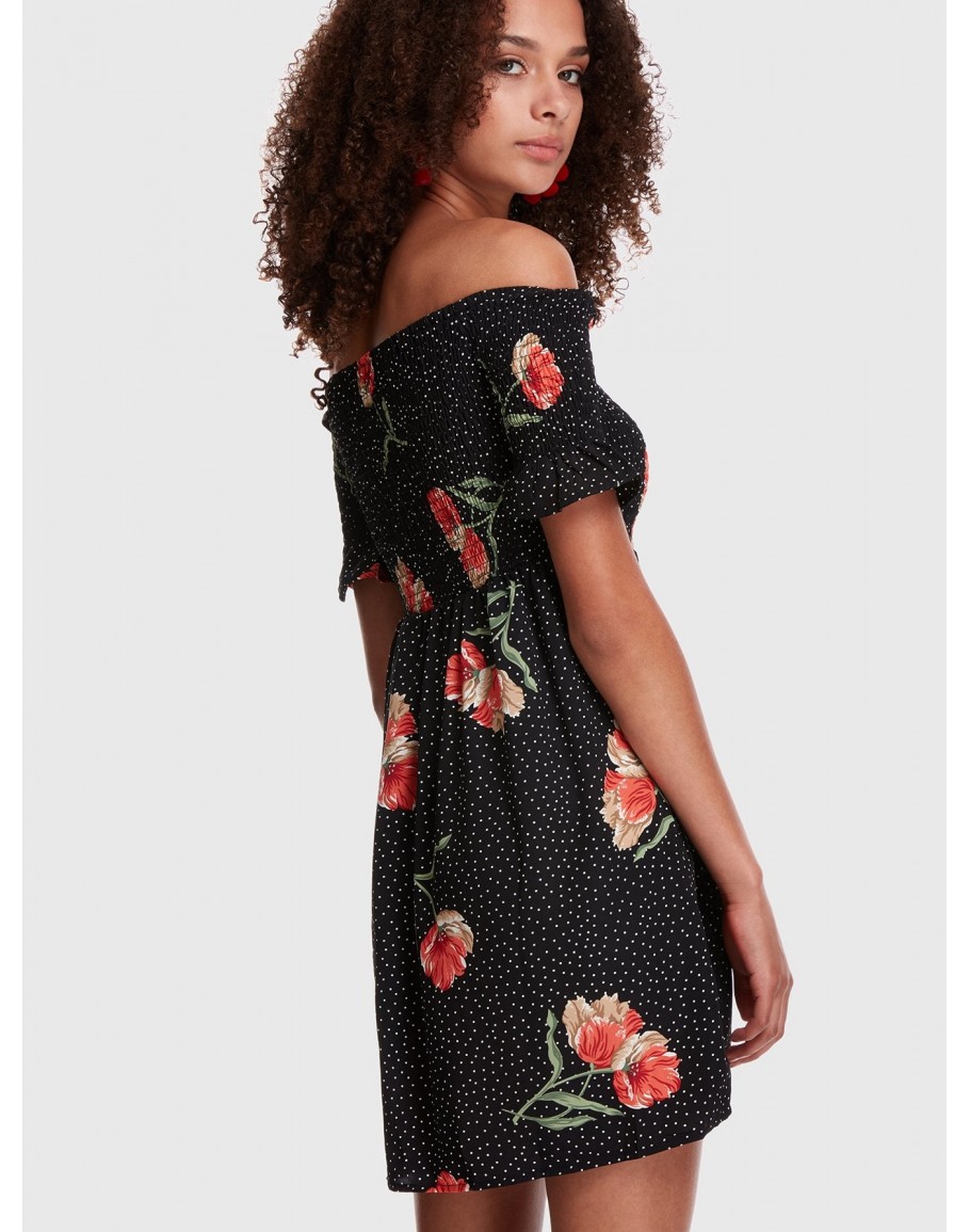 Polka Dot Floral Bardot Smocked Dress