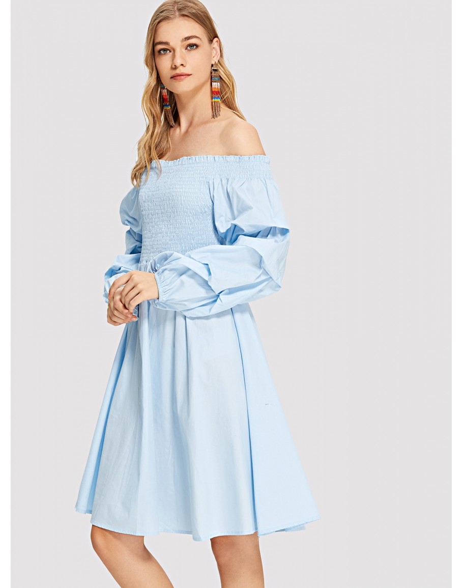 Shirred Bodice Gathered Sleeve Bardot Dress