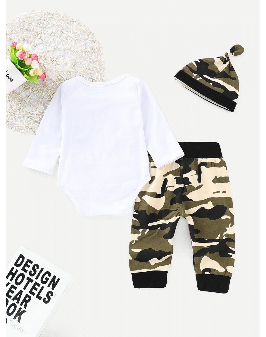 Baby Letter Print Jumpsuit & Camo Print Pants & Hat