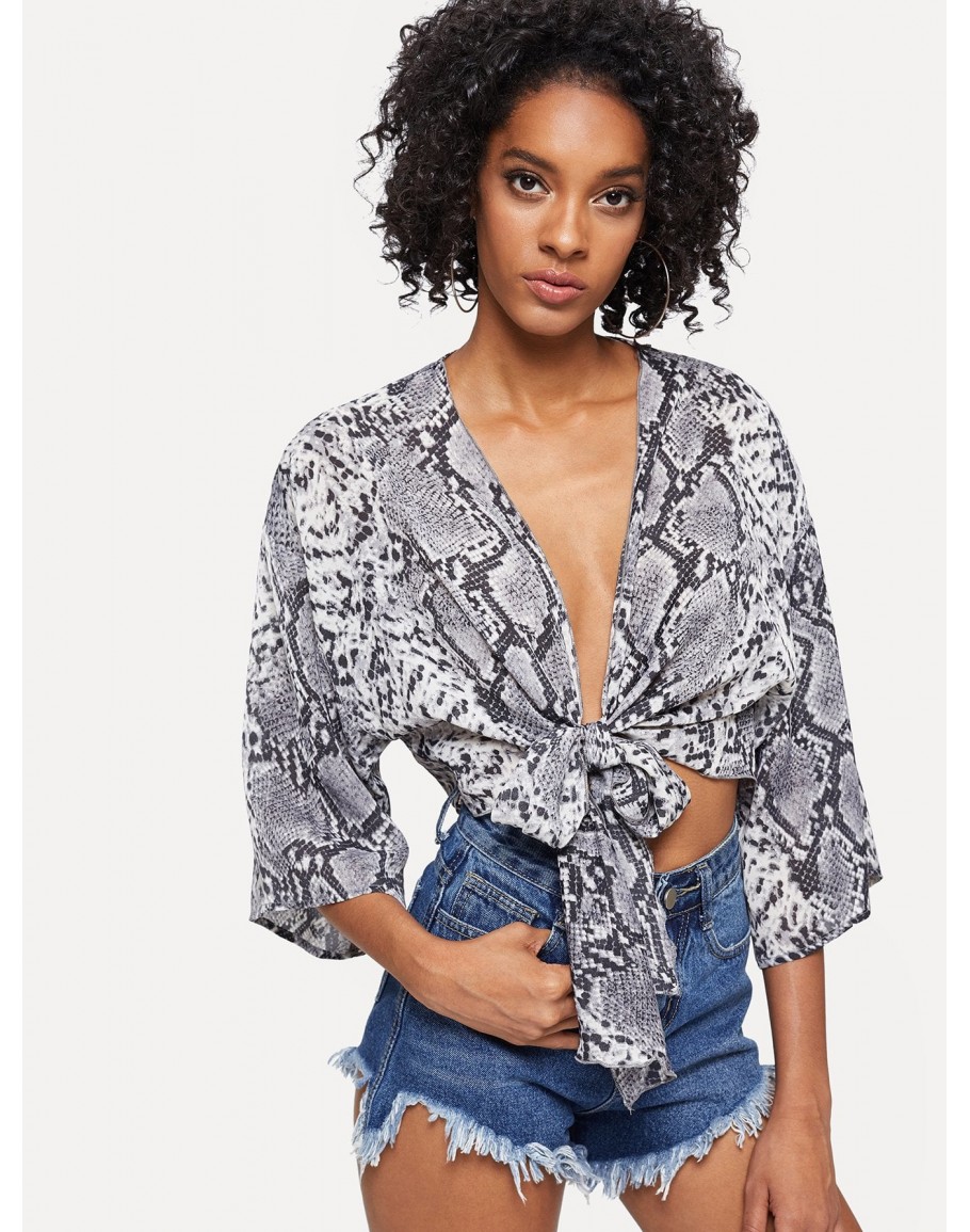 Knot Front Snake Skin Print Kimono