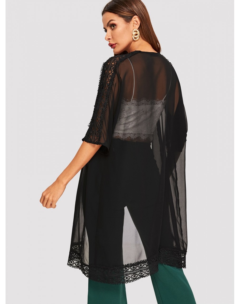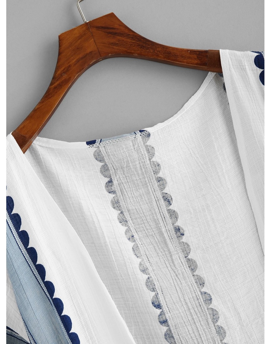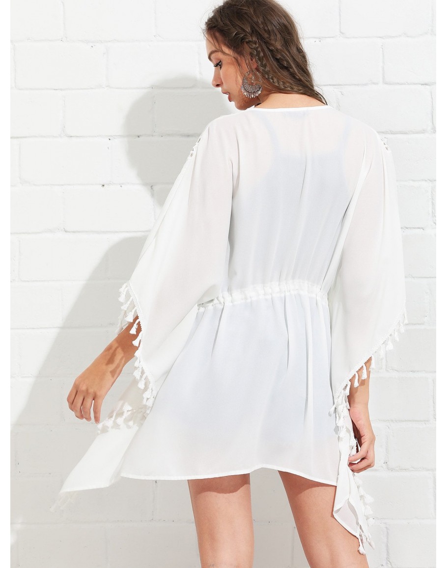 Lace Insert Tassel Trim Drawstring Waist Kimono