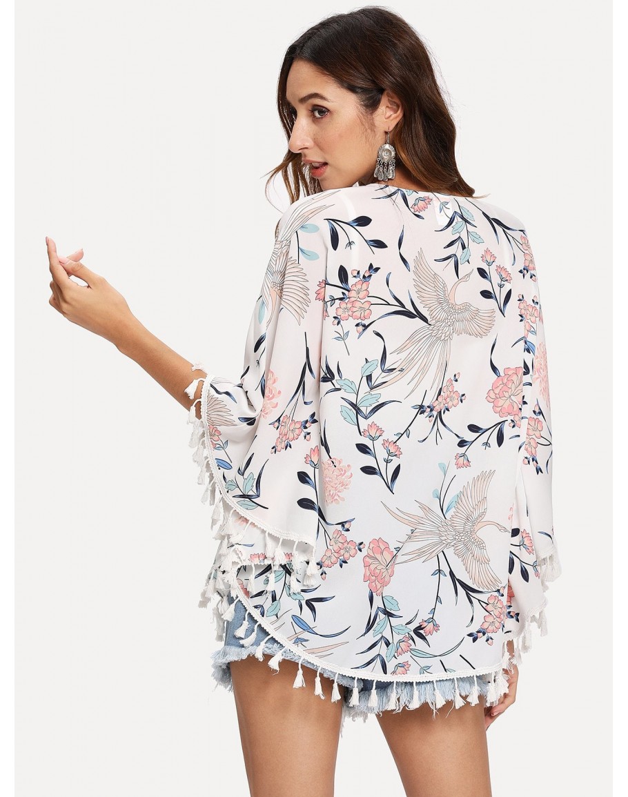 Tassel Trim Floral Print Kimono