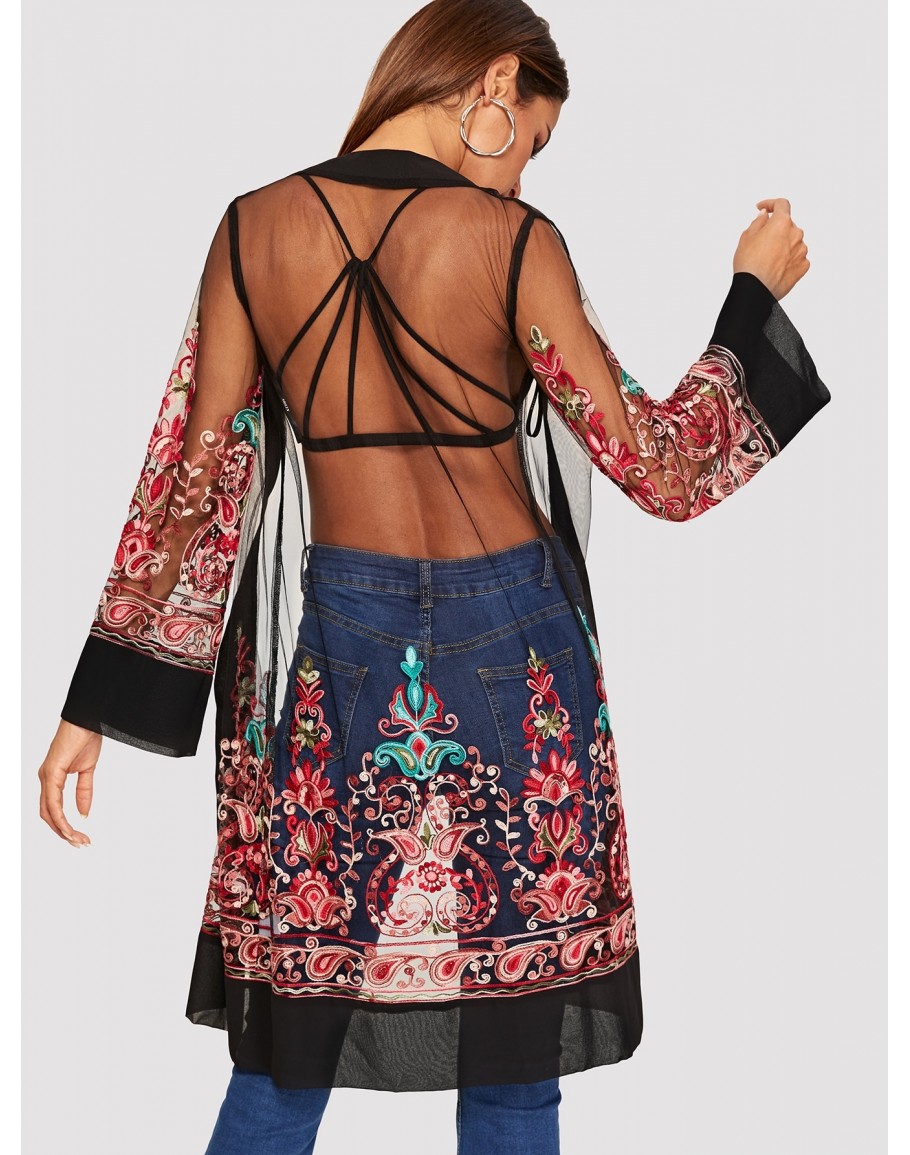 Open Front Mesh Flower Embroidered Kimono