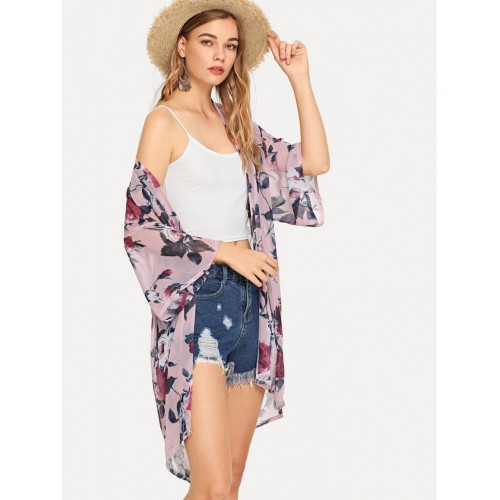 Open Front Floral Print Kimono