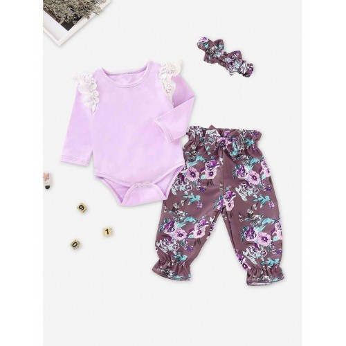 Baby Contrast Lace Eyelet Jumpsuit & Floral Print Pants & Headband