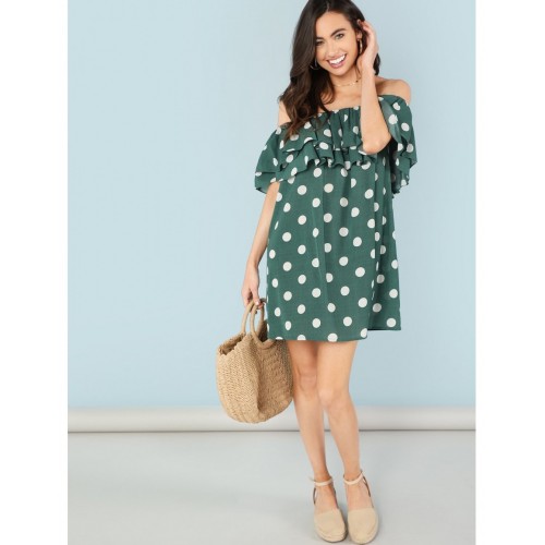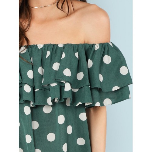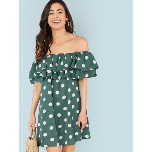 Layered Flounce Foldover Polka Dot Bardot Dress